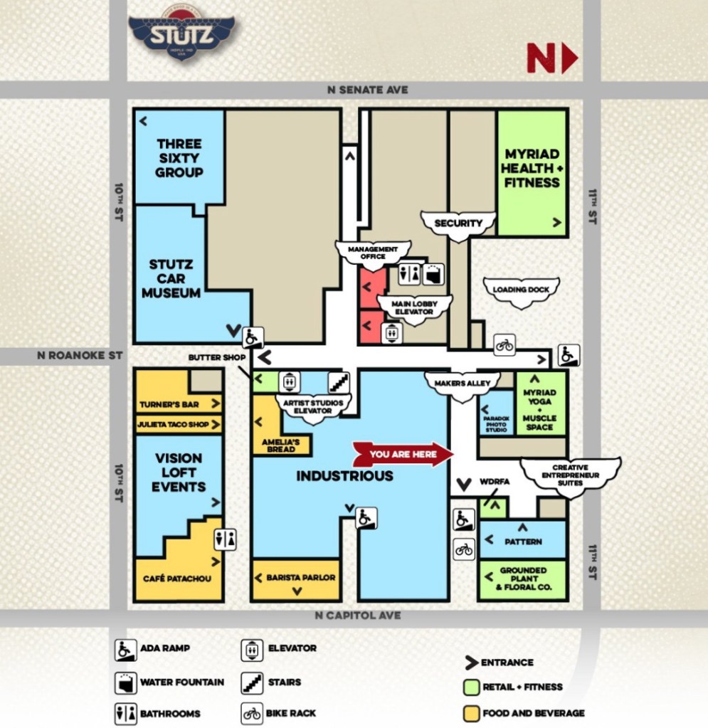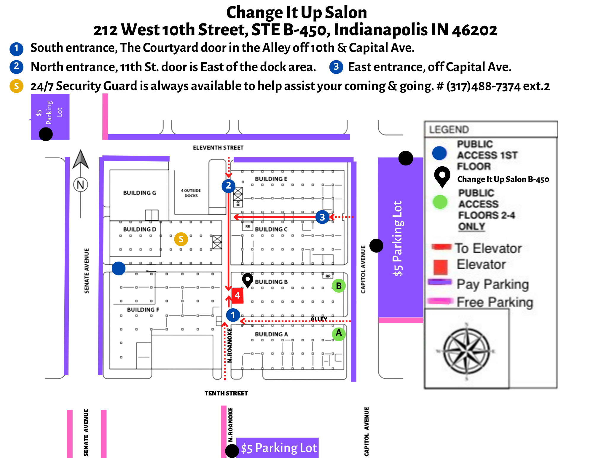 OPEN ENTRANCES The Courtyard South entrance (1) in Roanoke Ally off 10st and Capital Ave. The elevator is on the right after Butter Shop. Then the other two entrances are (2) which is off 11th Street entrance under The Stutz Sign and (3) is off Capital Ave after Grounded Plant & Floral shop. The elevator is at the other end of the hall on the left after Industrious and the freight elevator. Then go up to level 4 and Change It Up is the first studio on the left B-450 after the restrooms and the stairs. PLEASE only use the B elevator or the B stairway to the 4th floor due to construction. Please do not hesitate if you have any questions or if you would like me to meet you at one of the entrances. Stephanie #(317)292-7758 and the Stutz/Security # 1(317)488-7374.